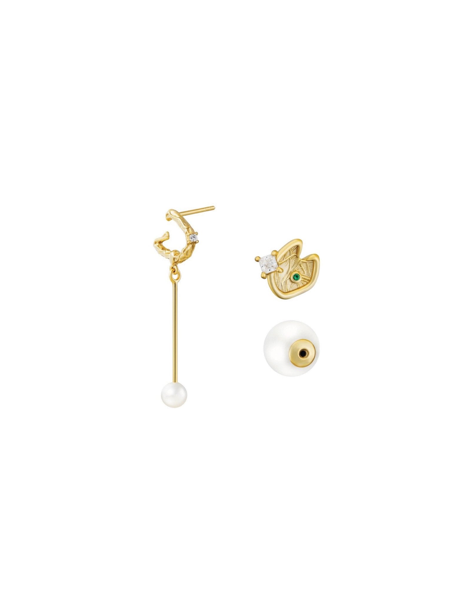 Drawing inspiration from the Caribbean Sea, these delicate stud earrings are styled as a mismatched pair. The C-shaped earring features a white stone and a beautiful dangling pearl. The stud is an island-shape with green and white stones and a pearl earring back. The Caribbean Earring pair allows for multiple ways of wear, suitable for all occasions.